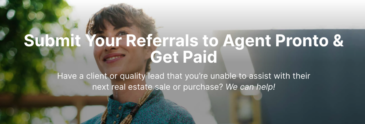 Signing up for the Agent Pronto referral programs requires a quick form and the signing of the agent agreement. Once signed up, the Agent Pronto team will match you with leads based on profile, production levels, service areas, client preferences, specialties, communication skills, customer ratings, and more. The referral fee for Agent Pronto is 25% to 30% of your commission.